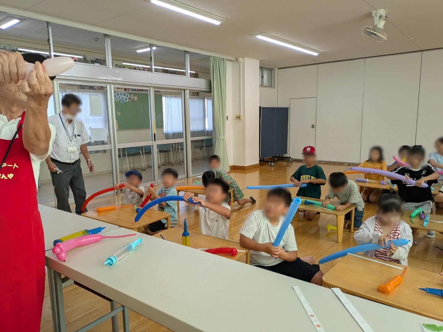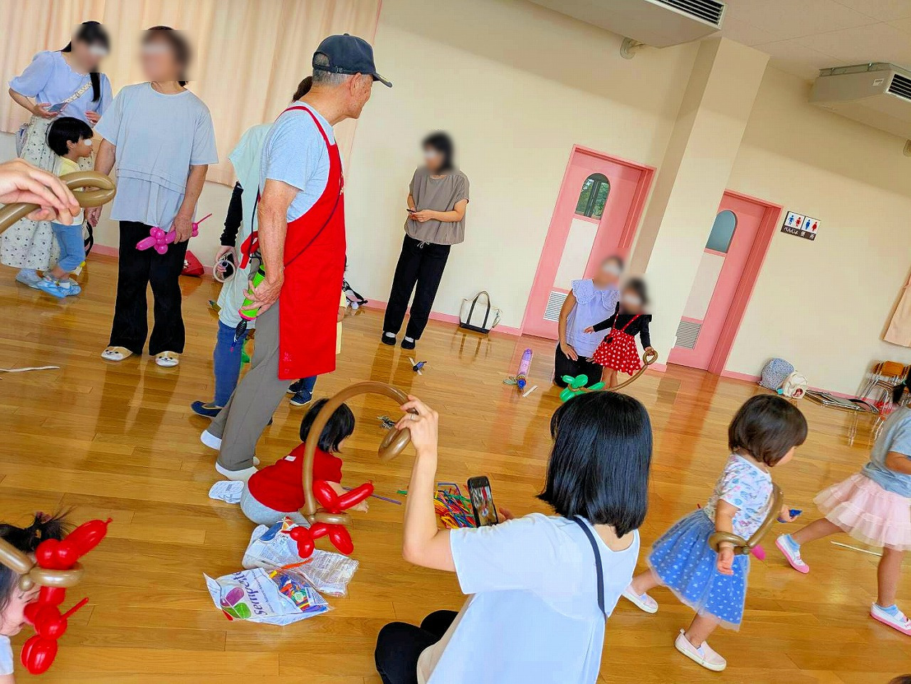 時節柄にマッチした演目で大変喜ばれました。腹話術も大好評でした。余った材料で子育て支援室に来ている幼児にもバルーンを渡しました。特にアンパンマン大人気でした。
