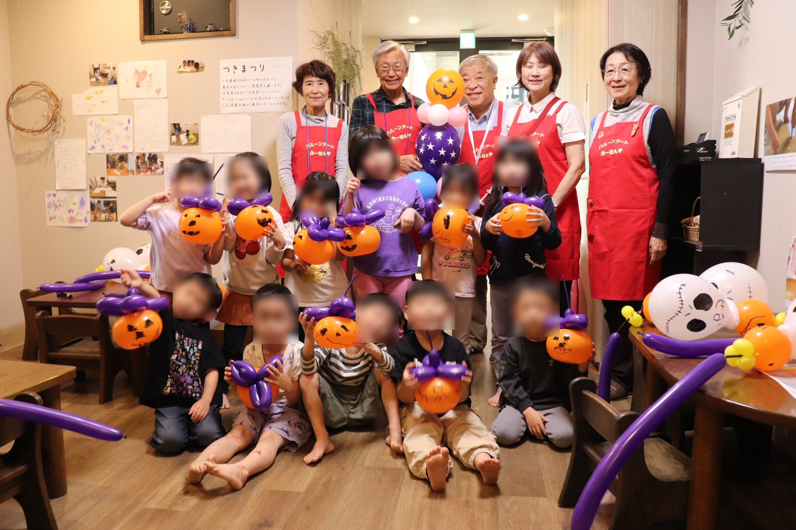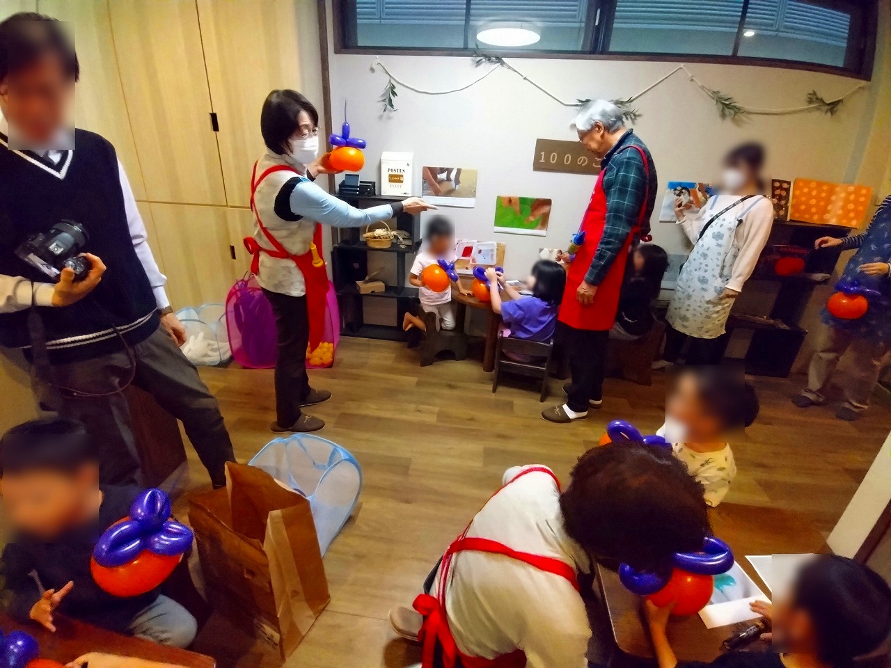 皆が大騒ぎしている間に、ハロウィンカボチャ顔のバルーンドールを作り、みんなで記念撮影しました。