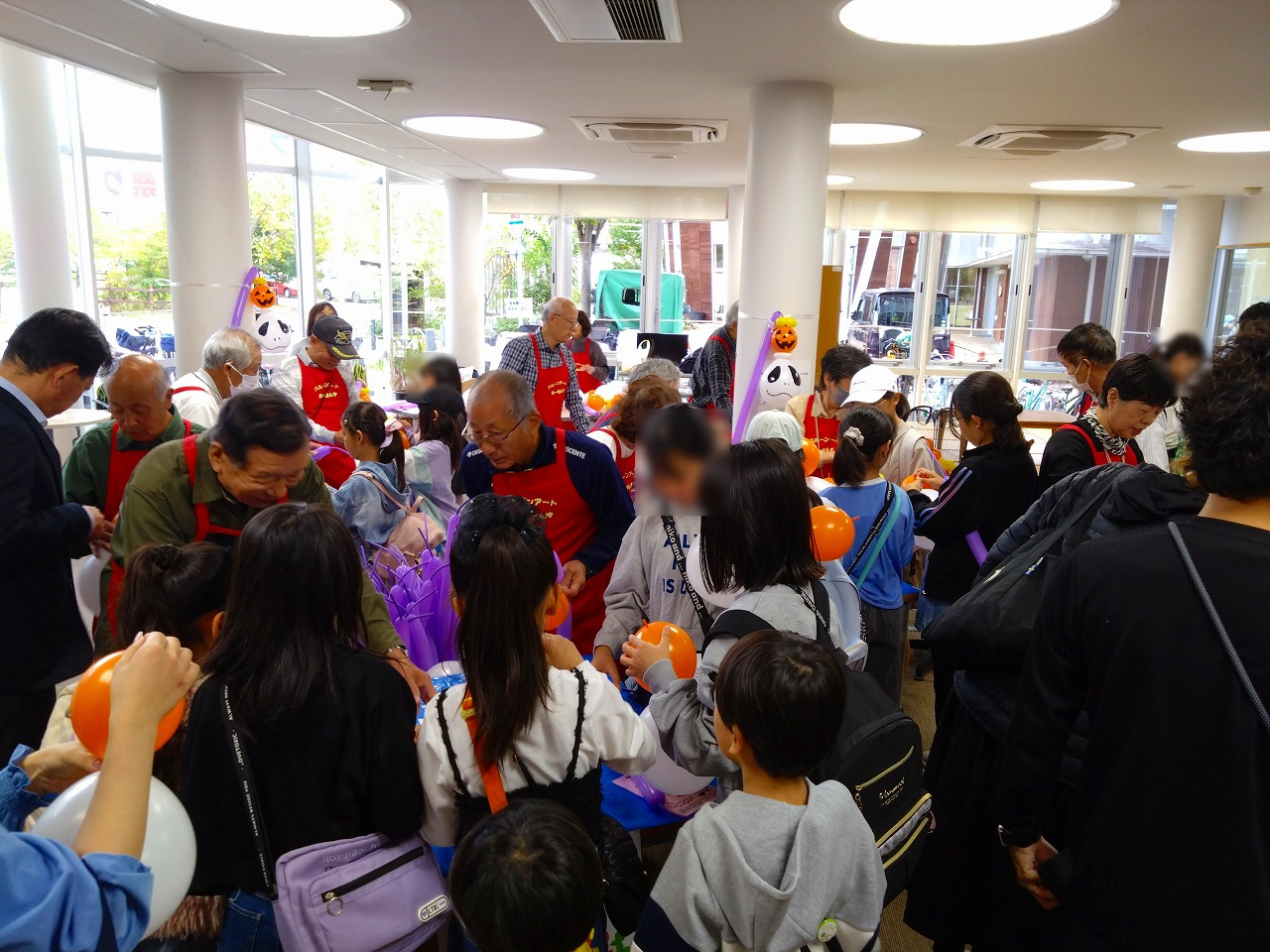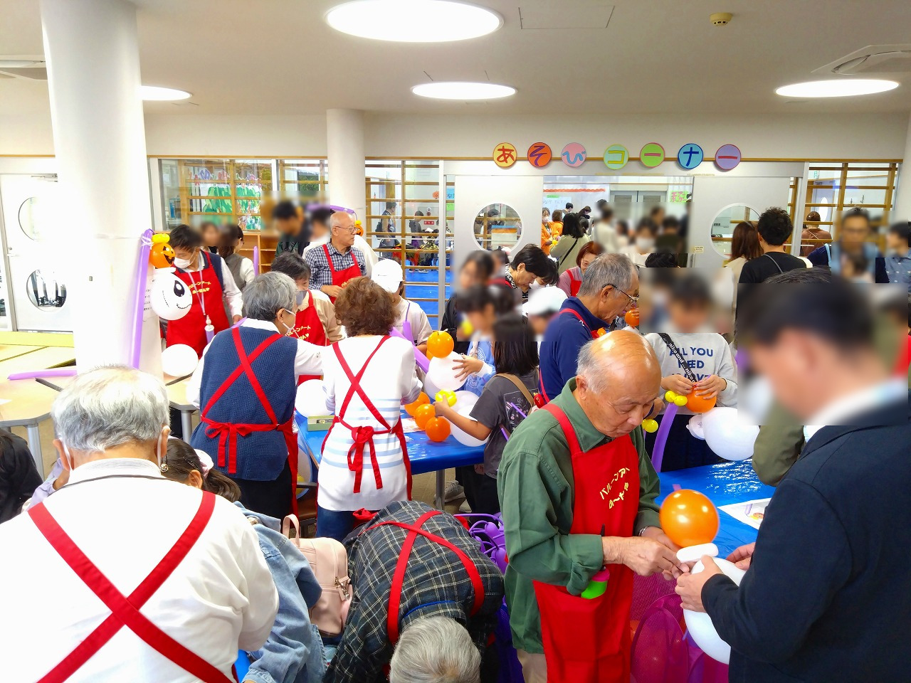 大型児童センターと老人福祉センター複合施設の、秋祭りボランティアです。一階入り口左側で場所も広く、多くの参加がありました。