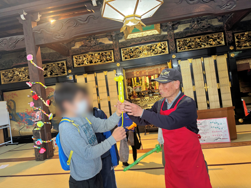まず住職の法話、紙芝居、腹話術があり、その後が子供のお遊びタイム。本堂と廊下にいくつかのゲームコーナーが設けられ、バルーンアートもその一つ。子供たちは、手首に花を巻き付け、サルを巻き付け、飛びネズミを飛ばし、ロケットを飛ばし、本堂を所狭しと、はしゃいでいた。