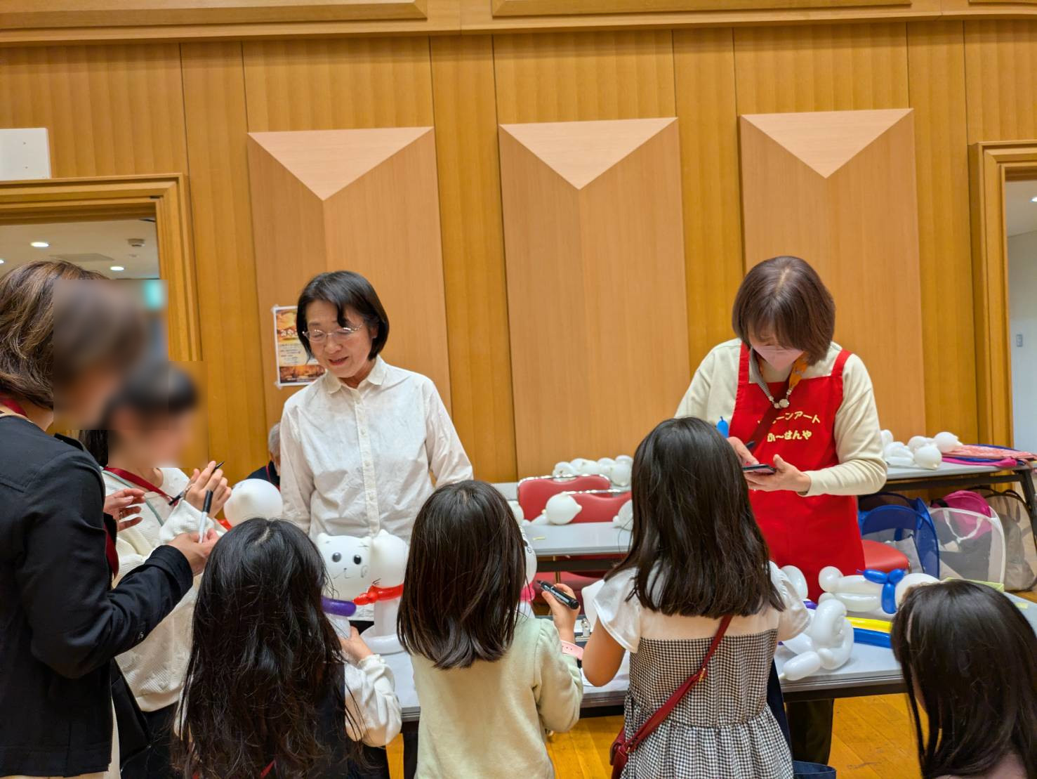 朝から雨で参加者の出足を気にしましたが、始まるとすぐにバルーンのコーナーに子供たちが集まり、準備したネコがどんどんなくなっていきました。バルーンを頑張って作る人は多くなかったですが、出来上がったネコの顔を自分で仕上げて、大事そうに持って帰って行きました。午後からの参加者は少ないのではと心配しましたが、昼から大ホールでステージがあり、多くの方が来られ、午後からも盛況で、作品を変えたこともあり、ネコを持っている人も違う作品を喜んで選んでいました。今回は、作った作品を持って帰っていただくスタイルが多かったです。