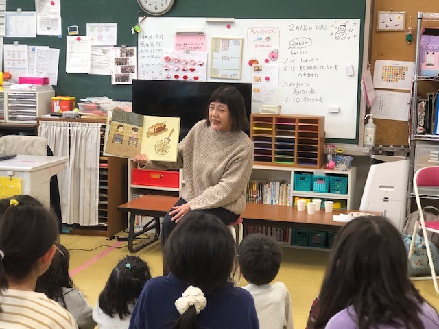 かぜが流行っていて、子どもたちの数は少なめだったが、「鬼は外」ならぬ「鬼も内」?ドーナツの穴はどうしてできたの?ニワトリはなぜ朝に鳴くの?クジラはなぜ潮を吹くの?といった子どもたちの好奇心をかき立てる紙芝居を行ったところ、子どのたちは真剣に興味津々の眼で観てくれた。また、質問も織り交ぜたところ、皆が積極的に手を挙げて、思い思いに答えてくれたので、大いに交流できた。