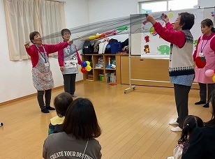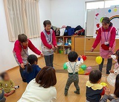 風船あそび、手作りおもちゃの自由あそび、サンタさんからのプレゼントを貰い、みんなで楽しいひと時を過ごしました。