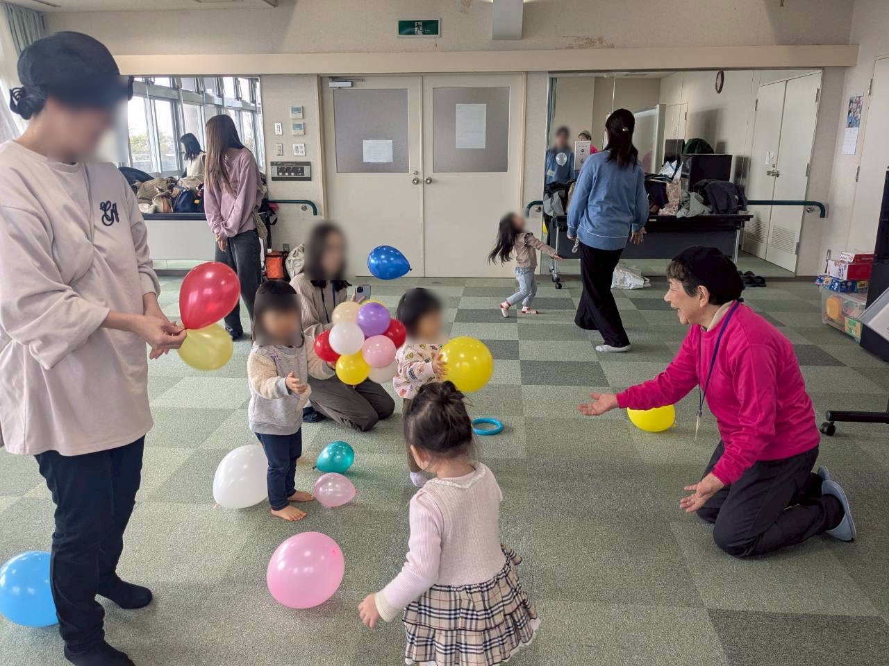 2才児、1才児、1才未満の可愛い7名の子ども達でした。出席者が揃うまでの時間は、風船を使っての自由遊びで過ごしました。