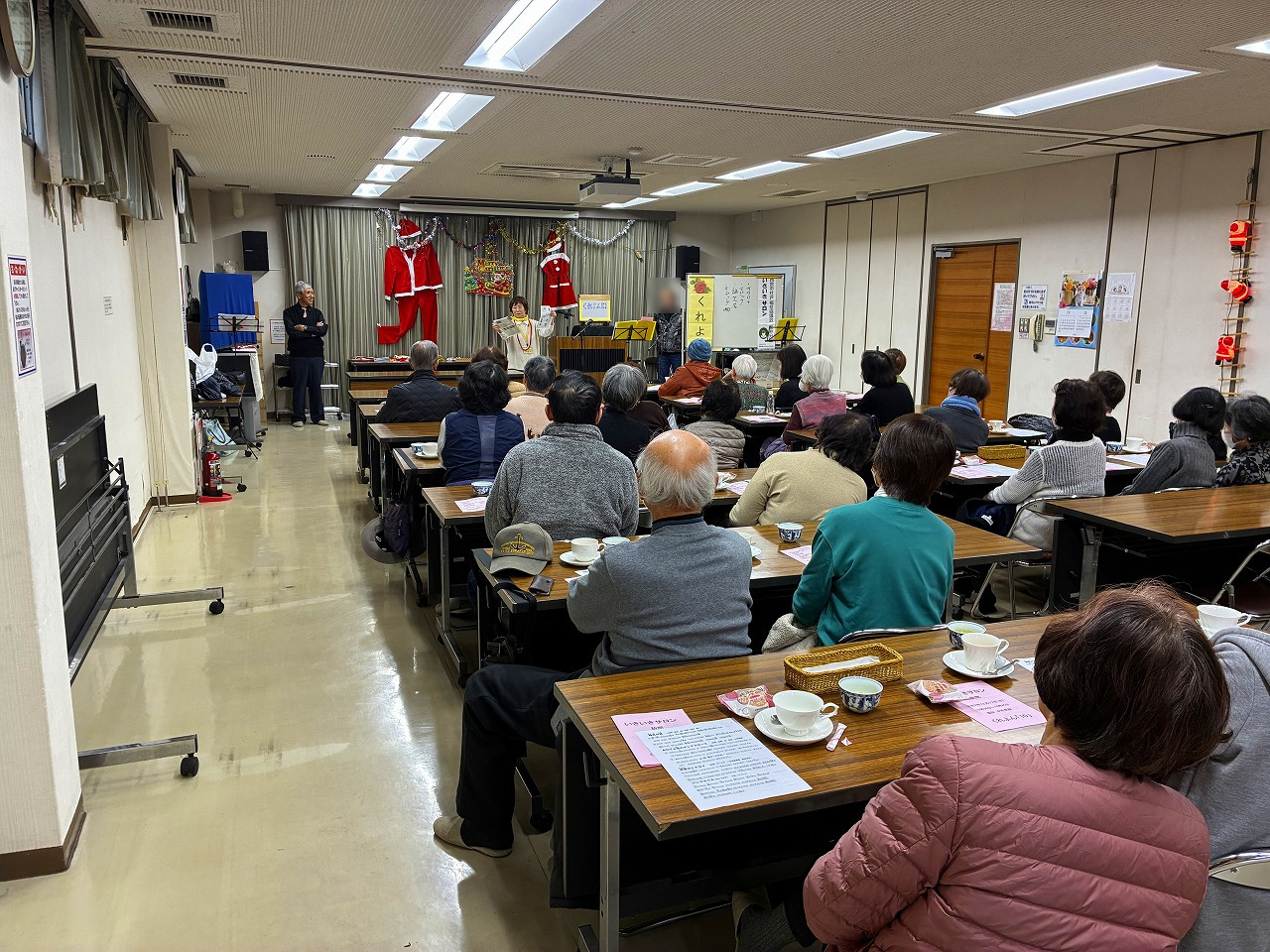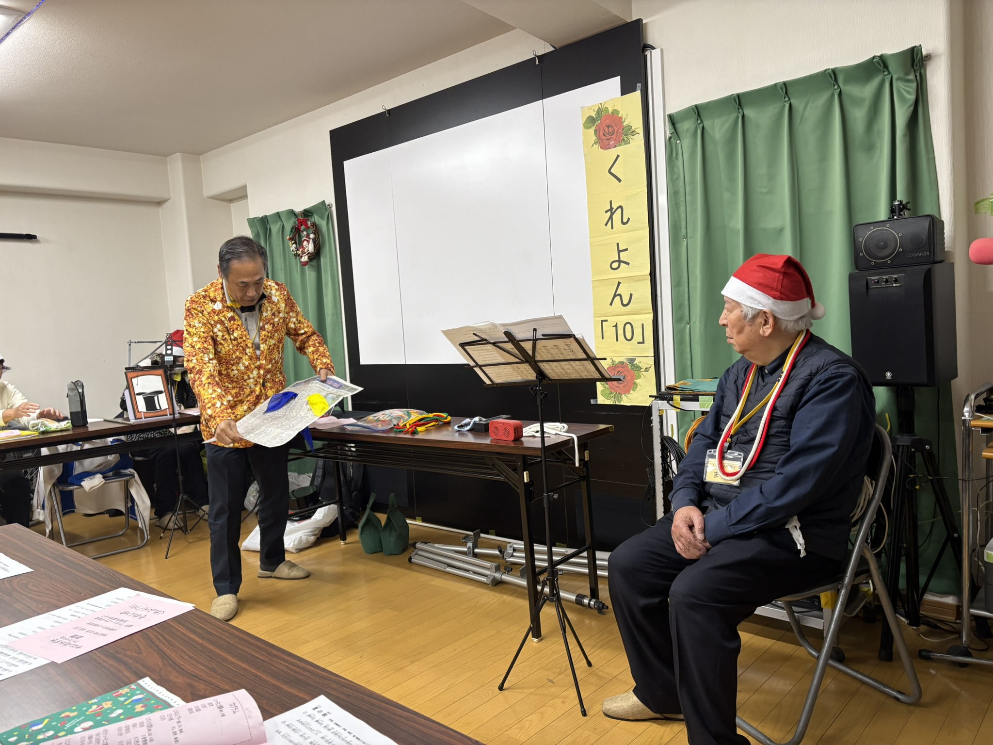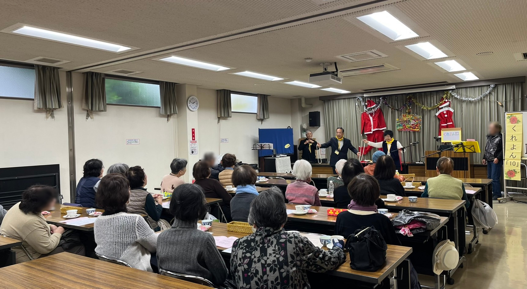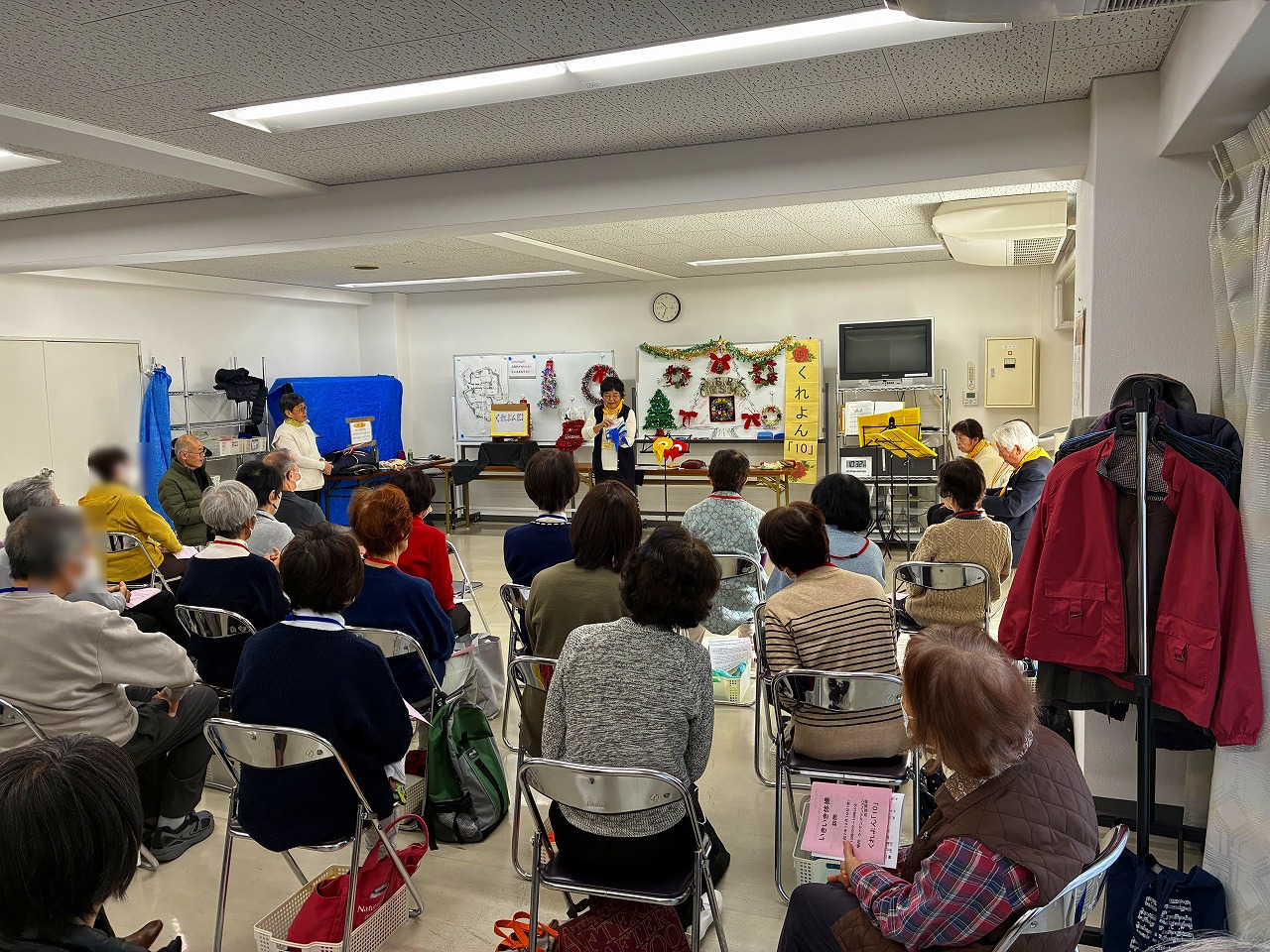 ■西宮市のボランティアセンターからの依頼で昨年(R6.12)に訪問して、今回は2回目の訪問となった。■オカリナ・ハーモニカ演奏、マジック、紙芝居の演技を行った。■オカリナ・ハーモニカ演奏で、会場の皆さんと 一緒に歌う事が出来た。■昨年と同様にマジッククラブ1名に応援参加をしていただき、会場からの反応が大きかった。■メンバーのマジックも拍手をいただき反響があった。■会場の皆さんに鈴を持っていただき、クリスマスソングを一緒ににぎやかに歌うことができた。■会場と一緒に楽しい活動ができた。■来年(R8年)の12月のクリスマス会にも参加を依頼された。