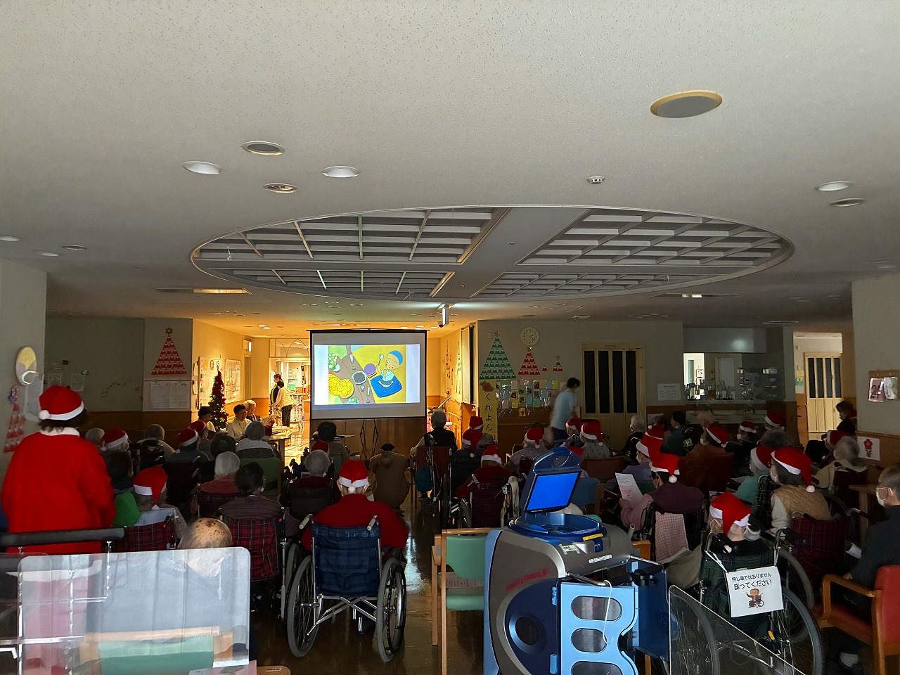 ■R4.12、R5.12、R6.12に訪問して、今回は4回目の訪問となった。■オカリナ・ハーモニカ演奏、マジック、紙芝居の演技を行った。■オカリナ・ハーモニカ演奏で、会場の皆さんと 一緒に歌う事が出来た。■マジックの演技に、拍手をいただき反響があった。■紙芝居で今回の演目の「平林」は、会場と一緒に盛り上がった。■会場の皆さんに鈴を持っていただき、クリスマスソングを一緒ににぎやかに歌うことができた。■会場と一緒に楽しい活動ができた。■来年(R8年)の12月のクリスマス会にも参加を依頼された。