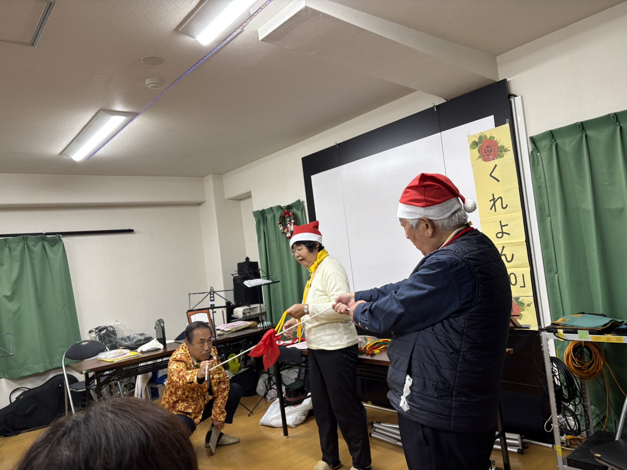 ■オカリナ演奏、マジック、紙芝居の演技を行った。■オカリナ演奏で、会場の皆さんと一緒に歌う事が出来た。■マジックの演技に、マジッククラブ1名に応援参加をしていただき、会場からの反応が大きかった。■他の方の、マジックも拍手をいただき反響があった。■紙芝居で今回の演目の「平林」は、会場と一緒に盛り上がった。■会場の皆さんに鈴を持っていただき、クリスマスソングを一緒ににぎやかに歌うことができた。■会場と一緒に楽しい活動ができた。■来年(R8年)の12月のクリスマス会にも参加を依頼された。