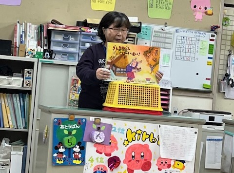 かぜが流行っていて、子どもたちの数は少なめだったが、「鬼は外」ならぬ「鬼も内」?ドーナツの穴はどうしてできたの?ニワトリはなぜ朝に鳴くの?クジラはなぜ潮を吹くの?といった子どもたちの好奇心をかき立てる紙芝居を行ったところ、子どのたちは真剣に興味津々の眼で観てくれた。また、質問も織り交ぜたところ、皆が積極的に手を挙げて、思い思いに答えてくれたので、大いに交流できた。