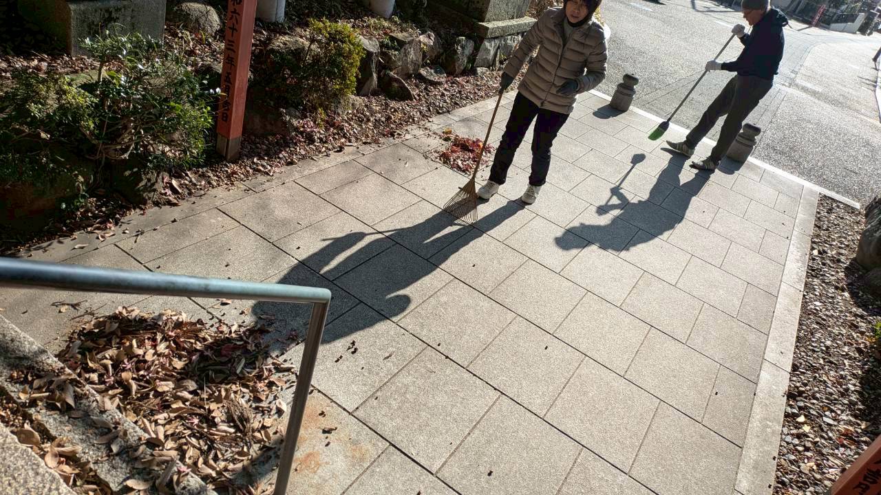 冬の寒さの中にも柔らかな日が差し込む、絶好の「掃除日和」となった。穏やかな気候に恵まれ、清々しい空気の中で作業を開始した。しかし、いざ作業を始めると、広大な境内を埋め尽くす大量の落ち葉に圧倒された。懸命に手を動かしたが、限られた時間内では全ての落ち葉を掃き切ることができず、神社の広さを改めて実感する結果となった。